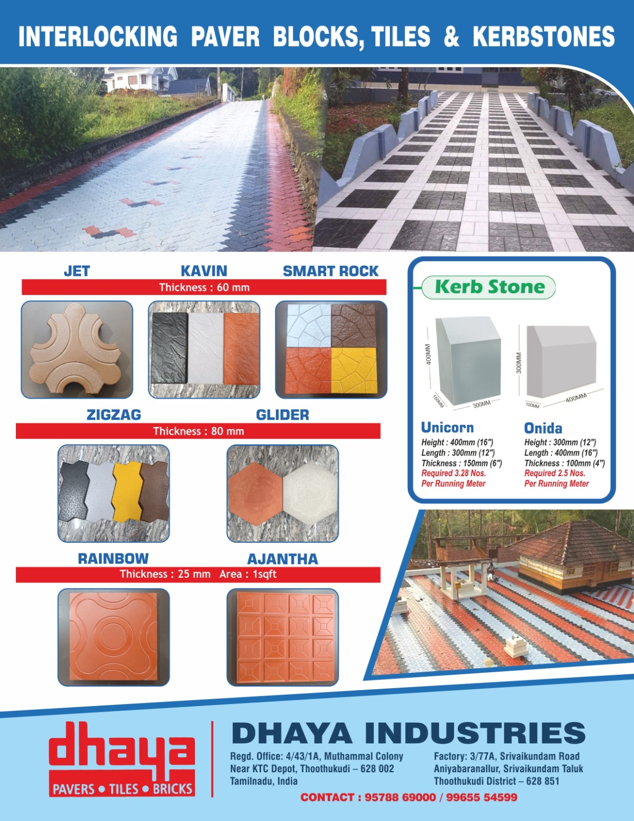 Dhaya Industries is a major company engaged in the manufacturing of wide range of construction products such as heavy duty drycast paver blocks, Interlocking paver blocks, hollow concrete blocks, kerb stones and fly ash bricks. All products are manufactured using high grade & quality raw material with latest generation world class automatic block making machines by dedicated teams of experts.